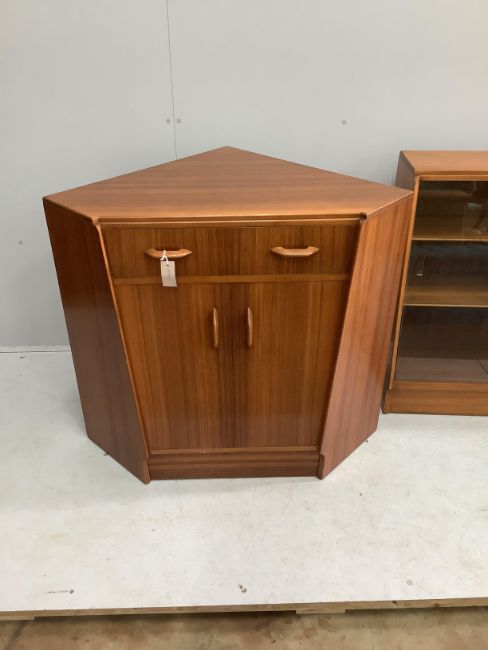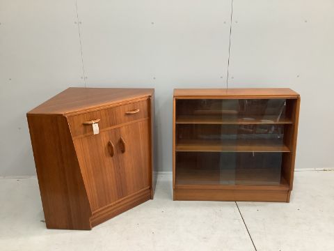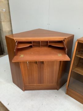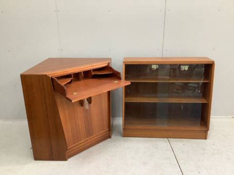 A mid century G-Plan teak corner bureau / combined bookcase, length 161cm, depth 70cm, height 85cm
