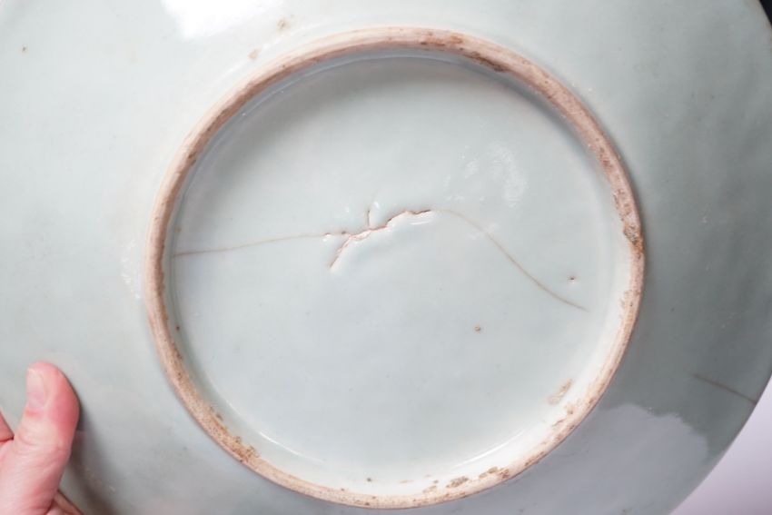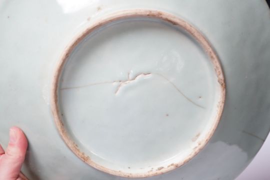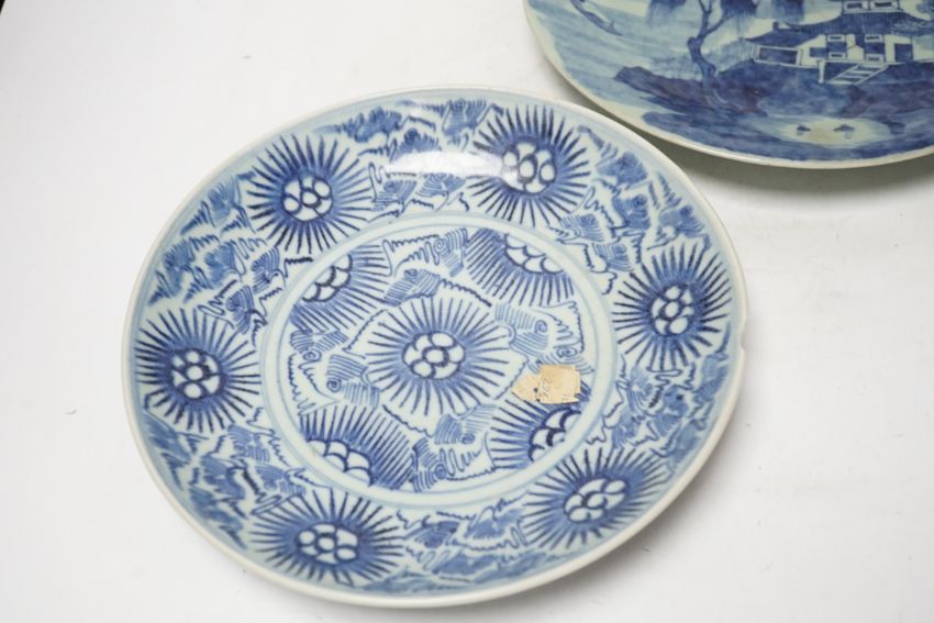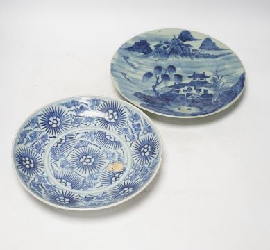 A 19th century Chinese celadon glazed blue and white landscape dish and a Diana Cargo dish, landscape dish 29.5cm diameter