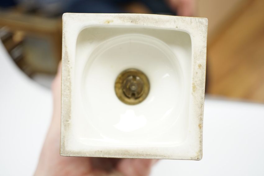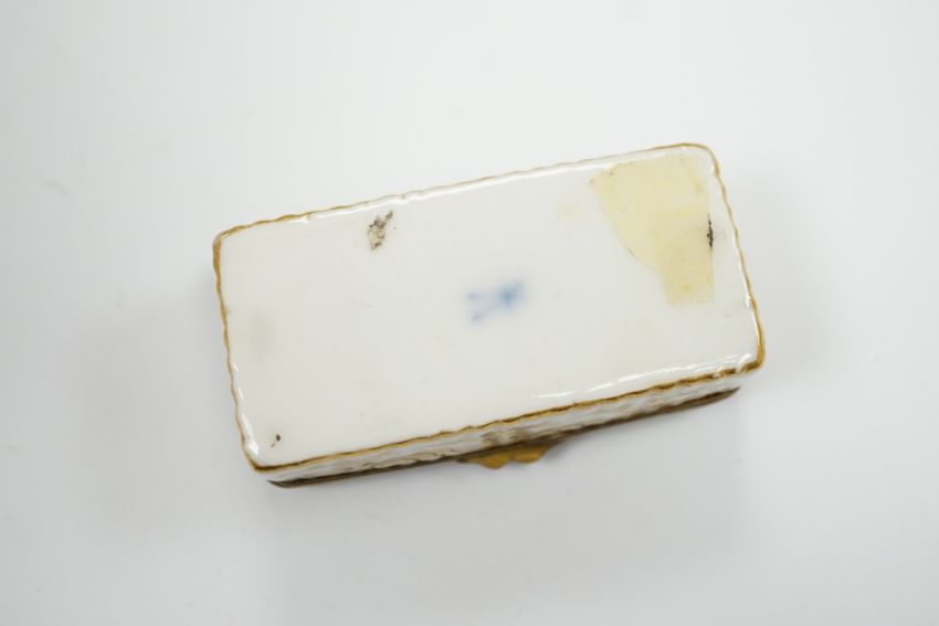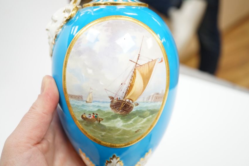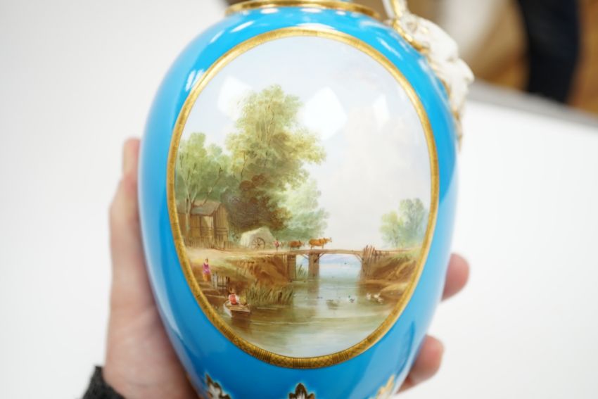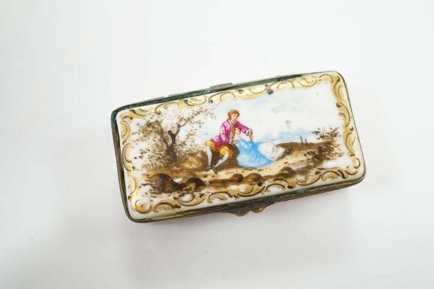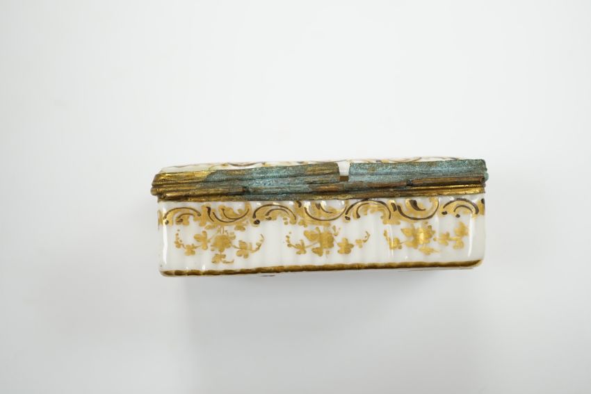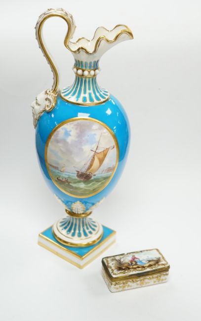 A 19th century Minton turquoise ground ewer, and a Continental porcelain snuff box and cover, ewer 29cm high Ewer handle has some restorer’s solution, believed to be an attempt to conceal three cracks; otherwise good including gilding.  Box good; brass mount at rear hinge torn and finish corroded green, see fourth image.