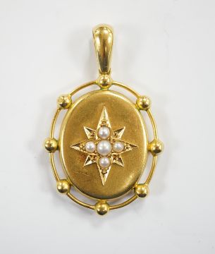 A Victorian yellow metal and split pearl set oval pendant, the glazed back with painted monogram beneath, EC, overall 48mm, gross weight 9.2 grams.