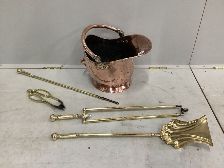 A Victorian copper coal scuttle together with four Victorian brass fire implements