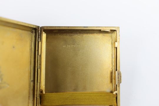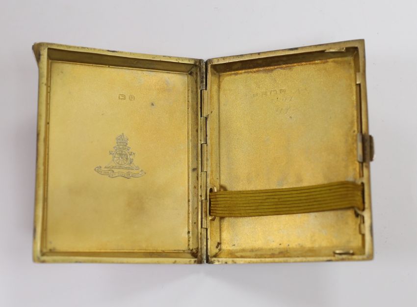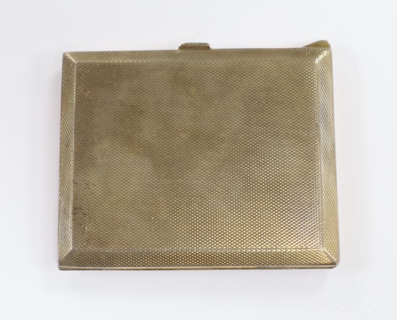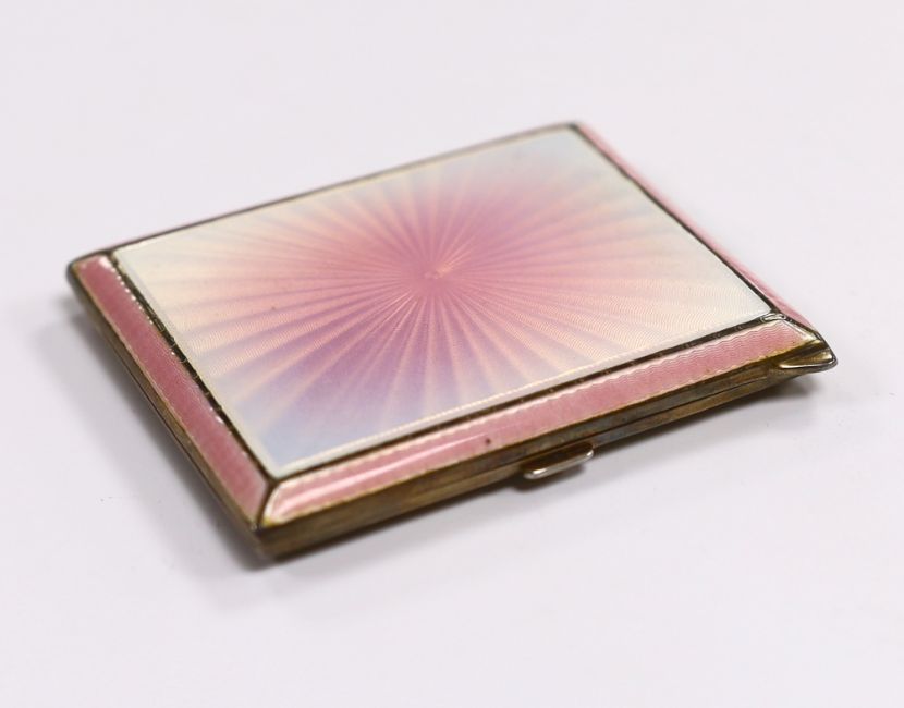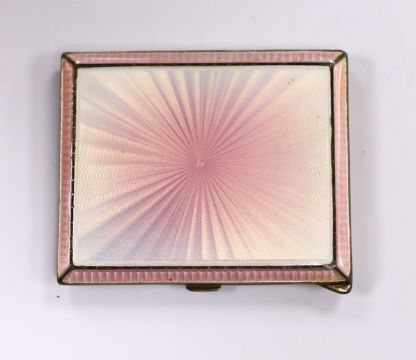 A George VI silver pink guilloche enamel cigarette case, by Albert Carter, Birmingham, 1938, 81mm. Some scratches and pitting to the enamel. Some minor losses to th corners of the enamel. The case snaps shut well.