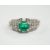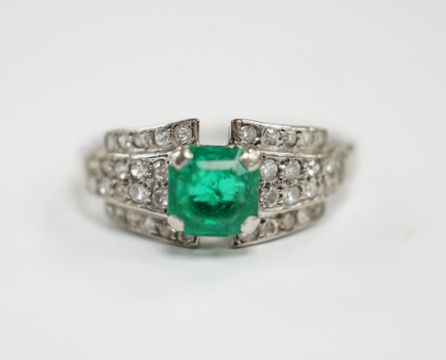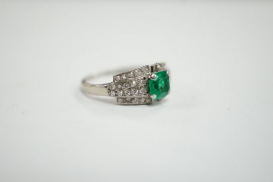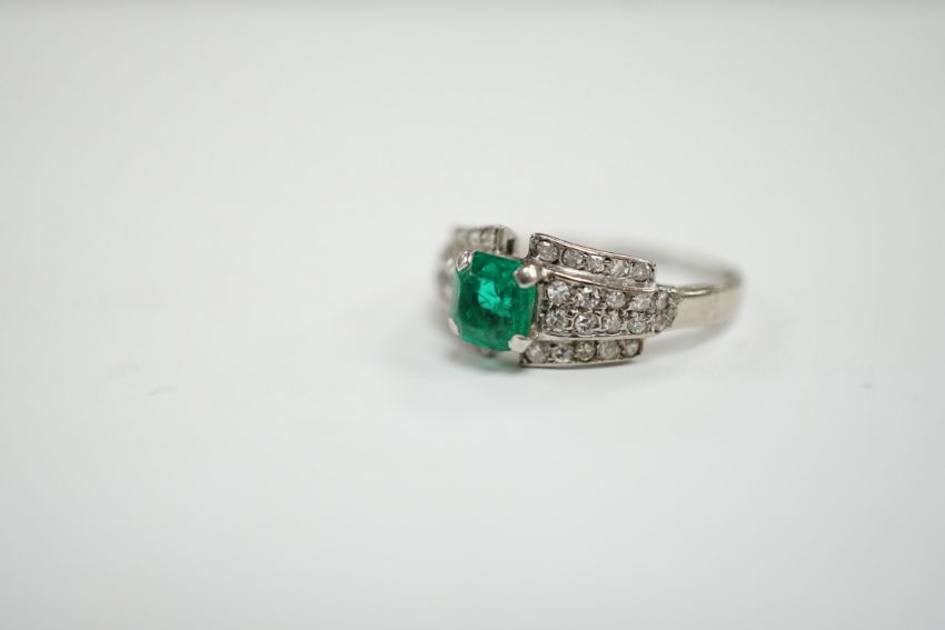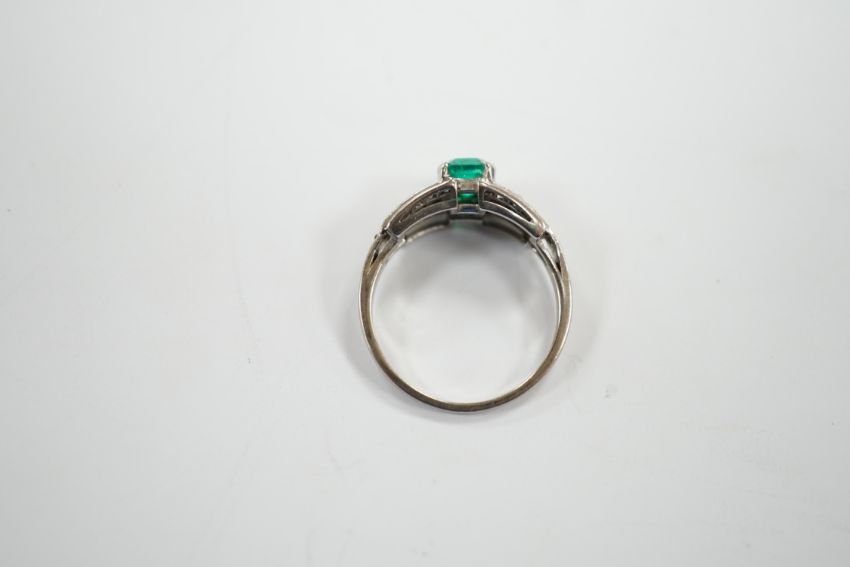 A white metal and octagonal cut emerald set dress ring, with diamond cluster set shoulders, size O, gross weight 3.6 grams.