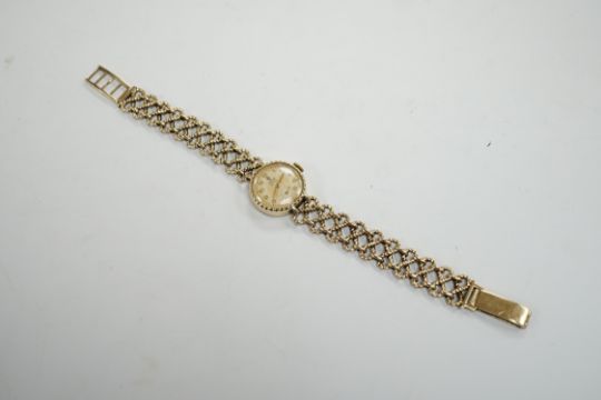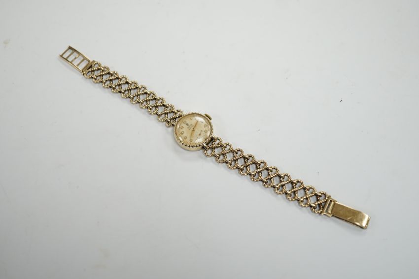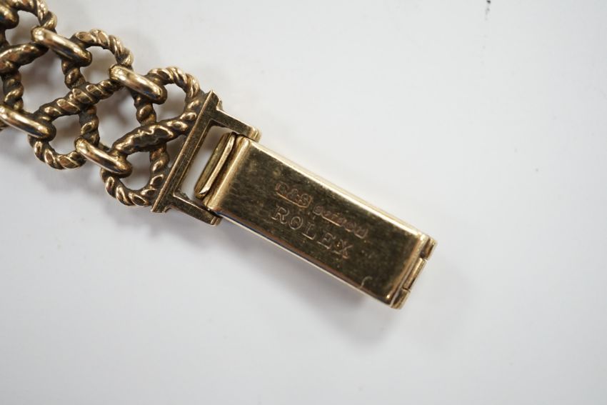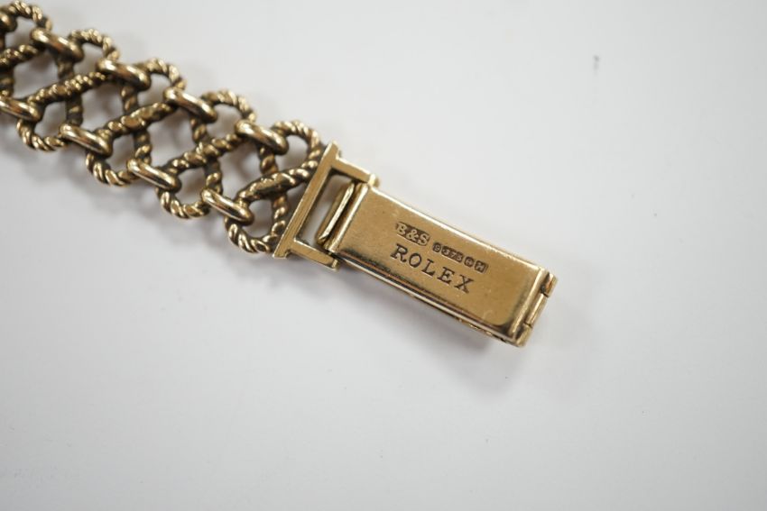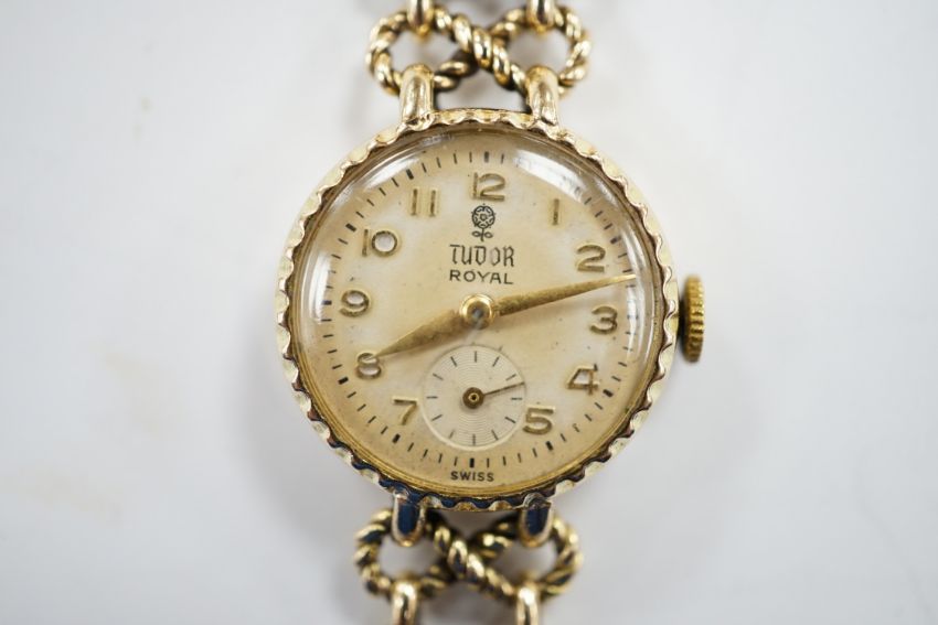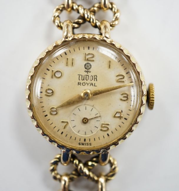 A lady's late 1950's 9ct gold Tudor Royal manual wind wrist watch, , on a 9ct gold Rolex bracelet, overall 18.5cm, gross 22 grams, with Rolex box.