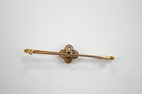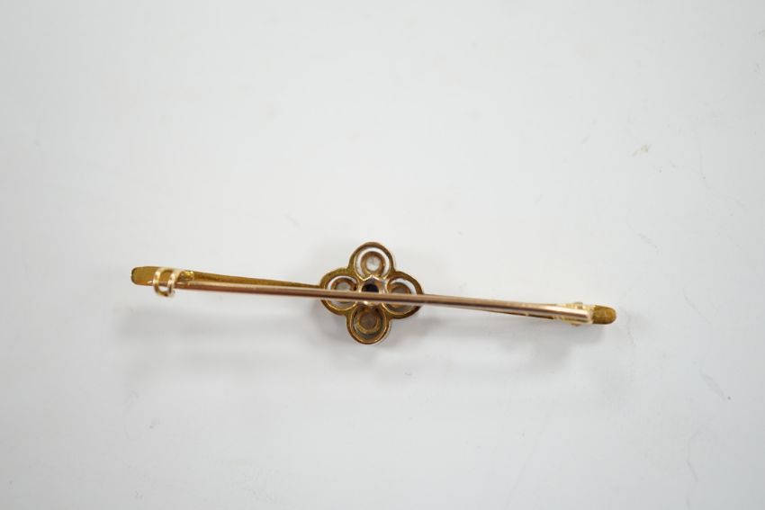 An Edwardian 15ct, sapphire and simulated diamond set four stone bar brooch, 55mm, gross weight 4.9 grams.