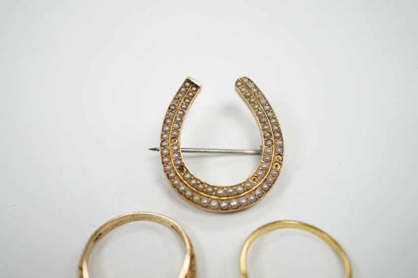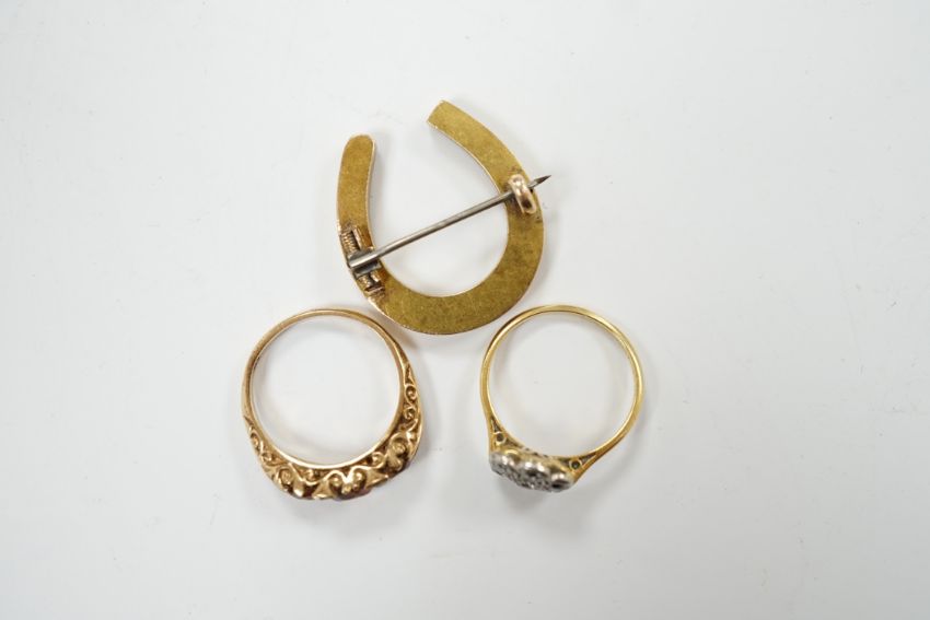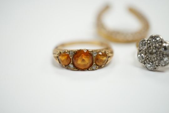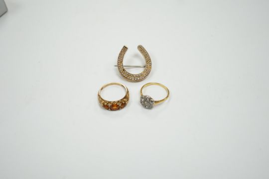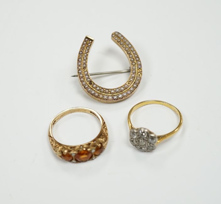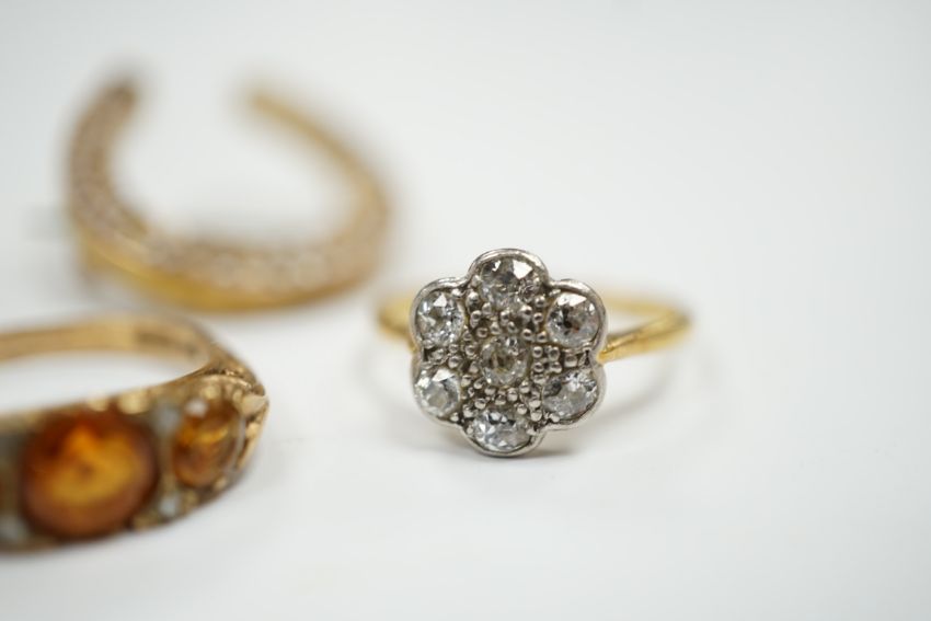 A 1920's 18ct, plat and millegrain set diamond flower head cluster ring, size L/M, a later 9ct gold and three stone citrine ring, with rose cut diamond chip spacers and a yellow metal seed pearl cluster set horseshoe brooch.