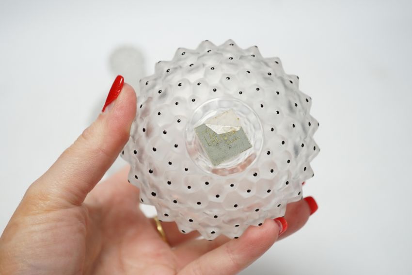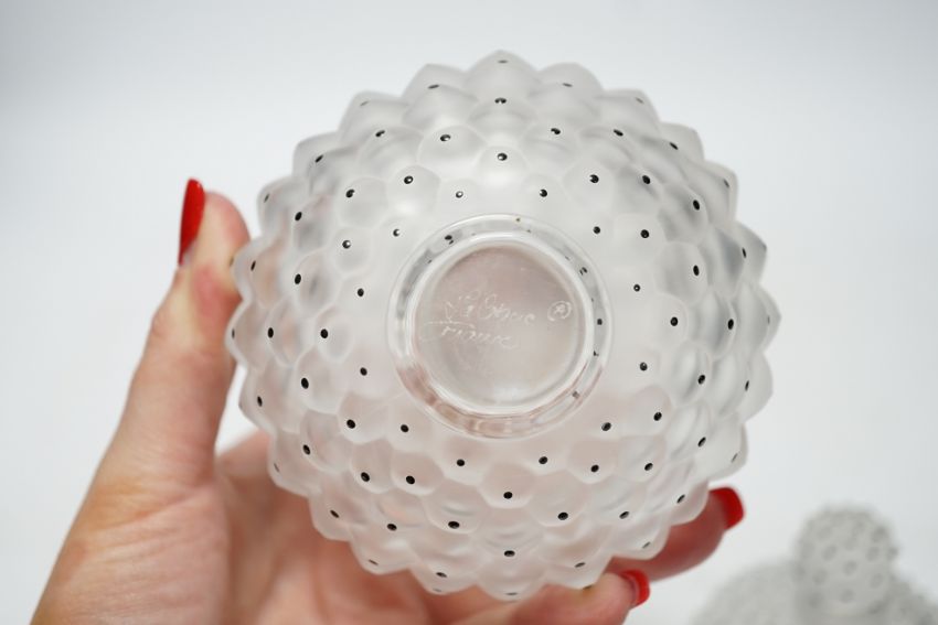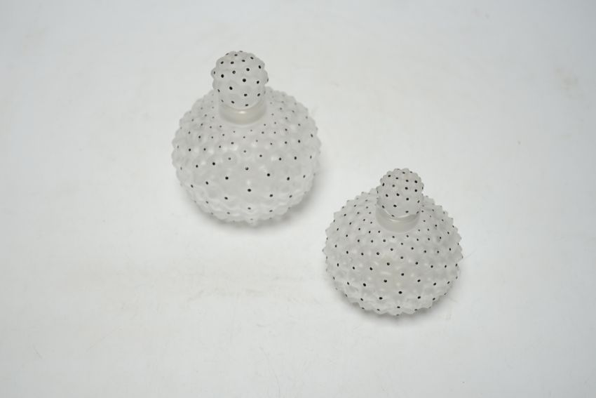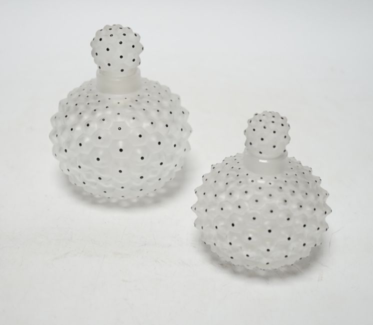 Two Lalique graduated cactus pattern glass scent bottles and stoppers, one with label to the base, largest 12cm high