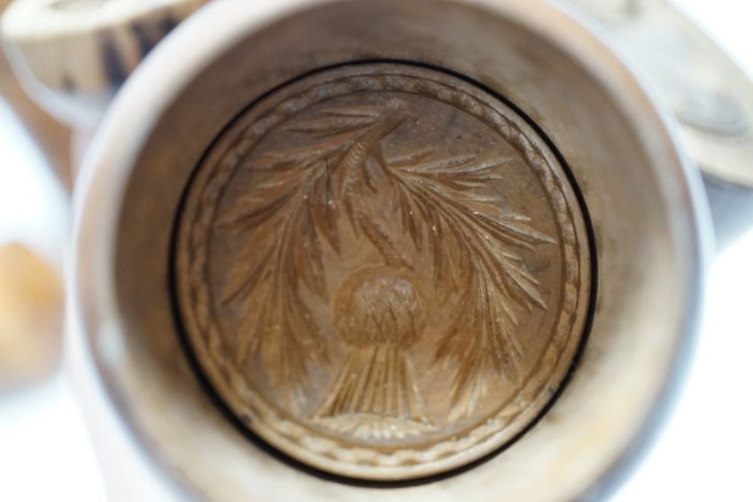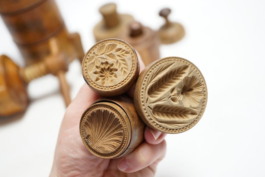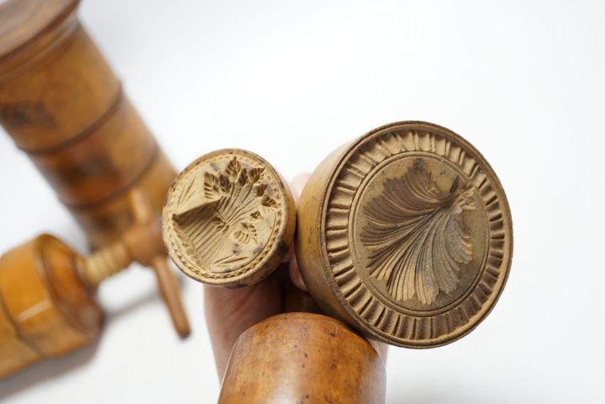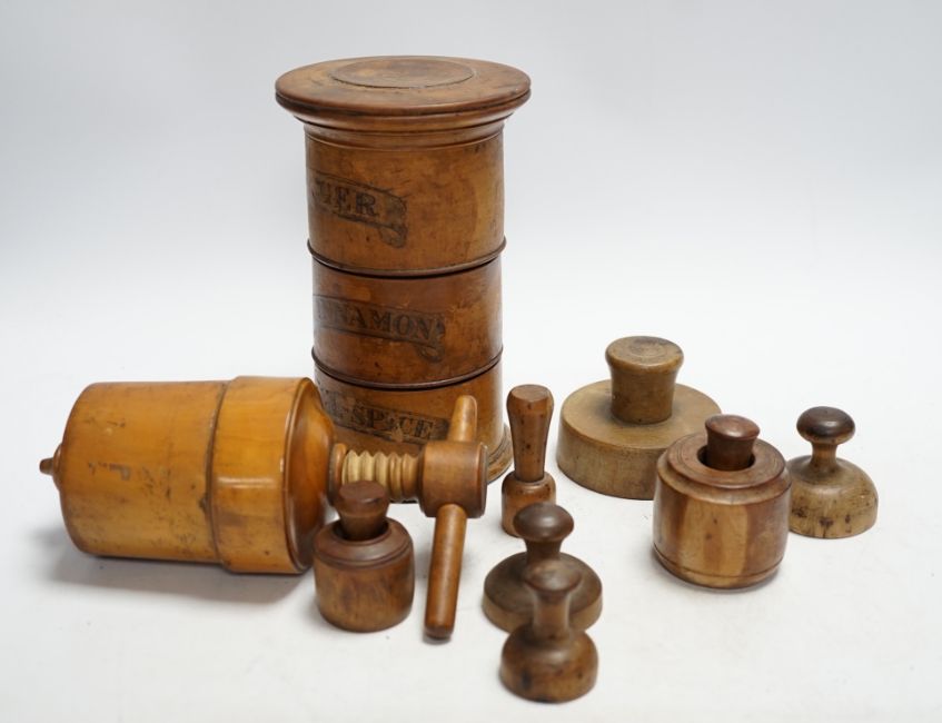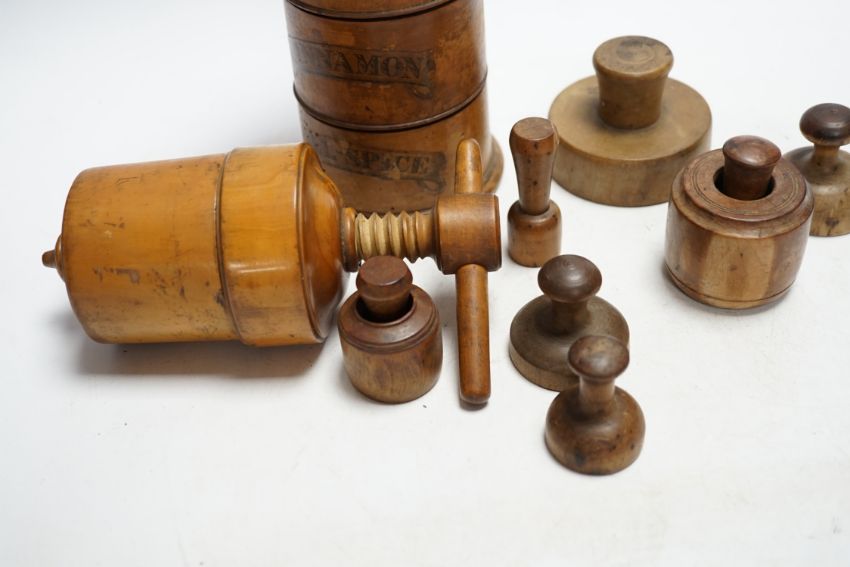Treen - a Victorian spice tower 18.5cm high, seven butter pats and a boxwood squeezer
