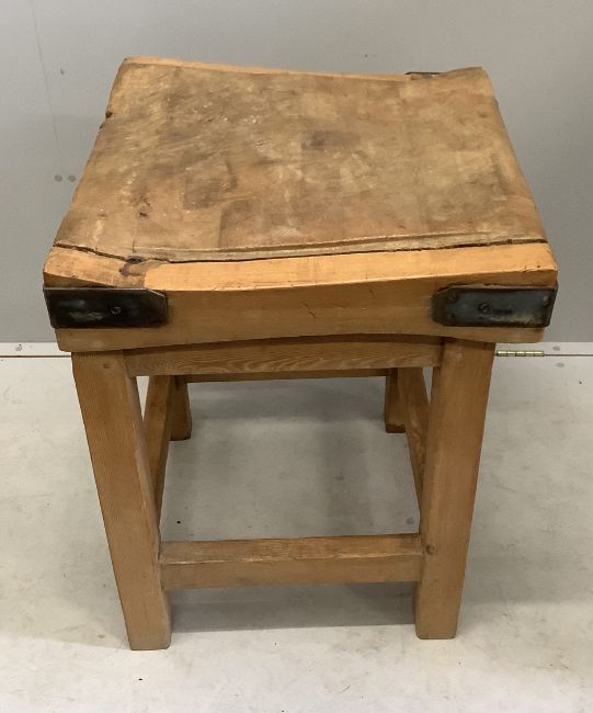 A Victorian iron bound butcher's block on pine stand, width 60cm, depth 61cm, height 81cm