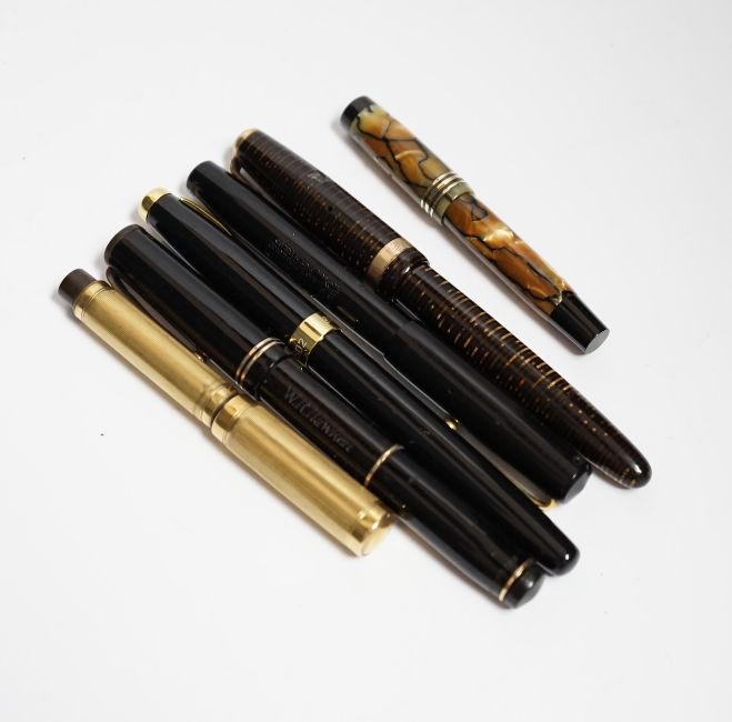 Six fountain pens including Parker and Swan, some with 14k nibs
