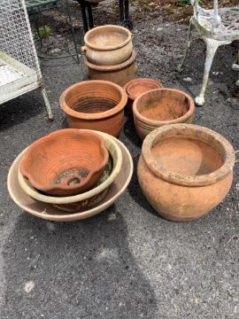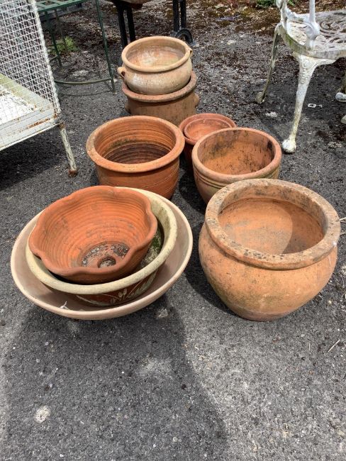 Ten assorted terracotta garden planters and three dish stands, largest diameter 32cm, height 30cm