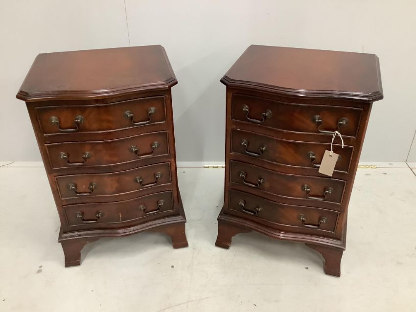 A pair of reproduction four drawer mahogany serpentine bedside chests, width 40cm, depth 35cm, height 61cm