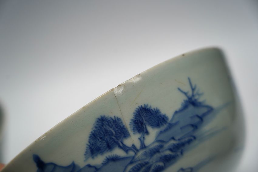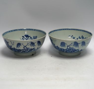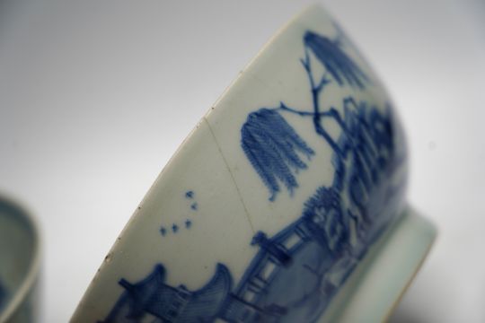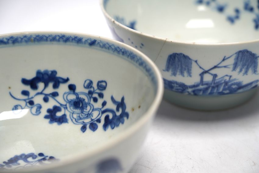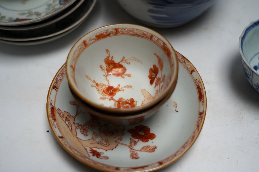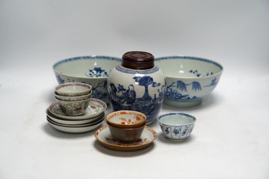 A group of 18th century Chinese and Japanese porcelain including blue and white bowls and jar with hardwood cover, largest 19cm in diameter***CONDITION REPORT***One bowl footrim chipped and bruised; firing flaw at footrim, not serious.  Other bowl large repaired chip; further small chips and a crack issuing from this chipped rim.  Ginger jar with hairline cracks, none serious; later wood cover.  One of the three matching teabowls with two long cracks; all with some wear to gilding; one of the four matching saucers with hairline crack inward from rim, approx. 15mm, all with wear to gilding.  One iron-red saucer two shallow chips to outside edge of rim.  Blue and white teabowl good. PLEASE NOTE:- Prospective buyers are strongly advised to examine personally any goods in which they are interested BEFORE the auction takes place. Whilst every care is taken in the accuracy of condition reports, Gorringes provide no other guarantee to the buyer other than in relation to forgeries. Many items are of an age or nature which precludes their being in perfect condition and some descriptions in the catalogue or given by way of condition report make reference to damage and/or restoration. We provide this information for guidance only and will not be held responsible for oversights concerning defects or restoration, nor does a reference to a particular defect imply the absence of any others. Prospective purchasers must accept these reports as genuine efforts by Gorringes or must take other steps to verify condition of lots. If you are unable to open the image file attached to this report, please let us know as soon as possible and we will re-send your images on a separate e-mail.