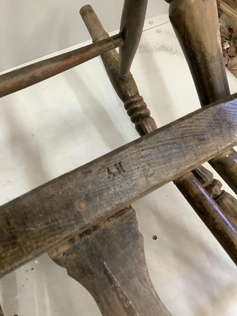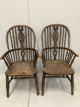 A pair of ash and elm Windsor wheel back armchairs, width 58cm, depth 48cm, height 112cm