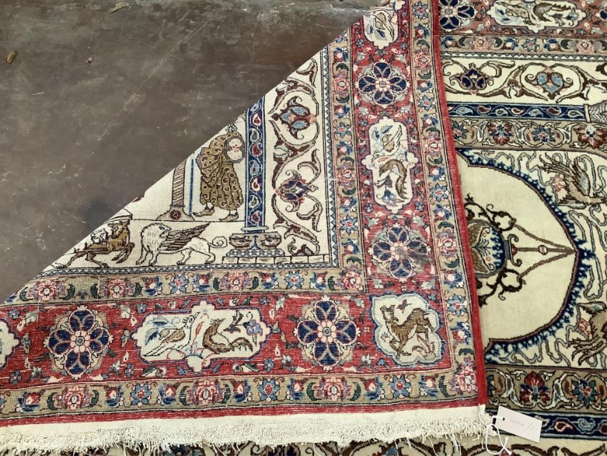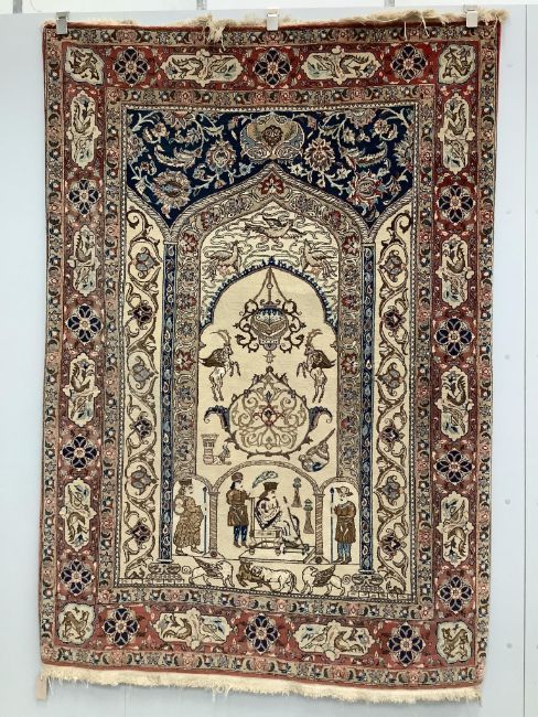 An unusual Isphahan pictorial prayer rug, woven with figures and animals, 195 x 140cm***CONDITION REPORT***PLEASE NOTE:- Prospective buyers are strongly advised to examine personally any goods in which they are interested BEFORE the auction takes place. Whilst every care is taken in the accuracy of condition reports, Gorringes provide no other guarantee to the buyer other than in relation to forgeries. Many items are of an age or nature which precludes their being in perfect condition and some descriptions in the catalogue or given by way of condition report make reference to damage and/or restoration. We provide this information for guidance only and will not be held responsible for oversights concerning defects or restoration, nor does a reference to a particular defect imply the absence of any others. Prospective purchasers must accept these reports as genuine efforts by Gorringes or must take other steps to verify condition of lots. If you are unable to open the image file attached to this report, please let us know as soon as possible and we will re-send your images on a separate e-mail.  Pile is short and worn. A few minor stains and some areas of discolouration. No holes, moth or repairs.