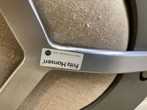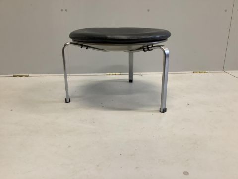 A Poul Kjaerholm PK20 circular stool, diameter 53cm, height 34cm Has a Fritz Hansen sticker dated 1994. Leather showing signs of wear and has lost the central button, otherwise good.