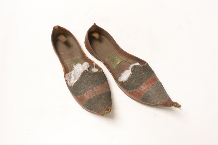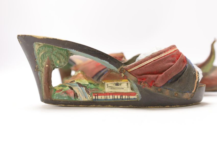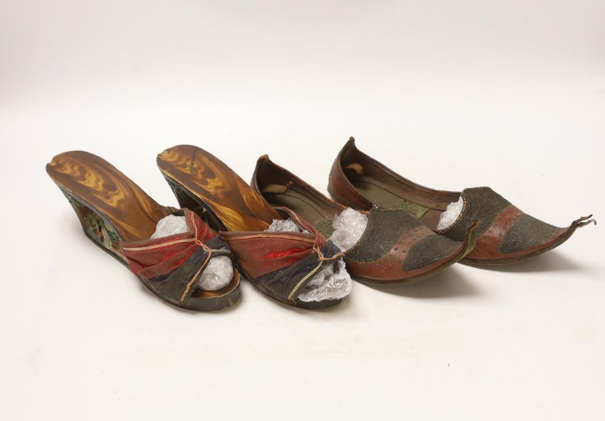 Two pairs of shoes; a small pair of novelty carved wooden heeled clogs with Philippine’s 1945 painted on the back of the heels and a carved house and mountainous scene within the heel and sole, together with a pair of leather and metal embroidered Turkish slippers
