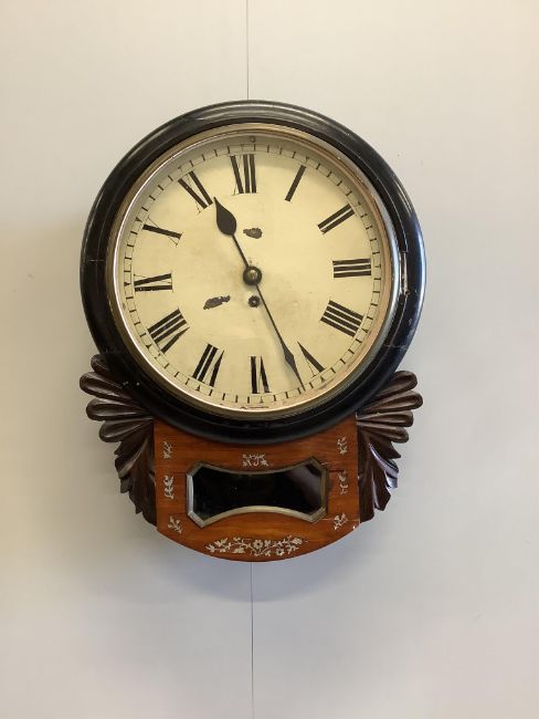 An early 19th century mother-of-pearl inlaid drop dial wall timepiece, width 38cm, height 50cm. Condition - fair