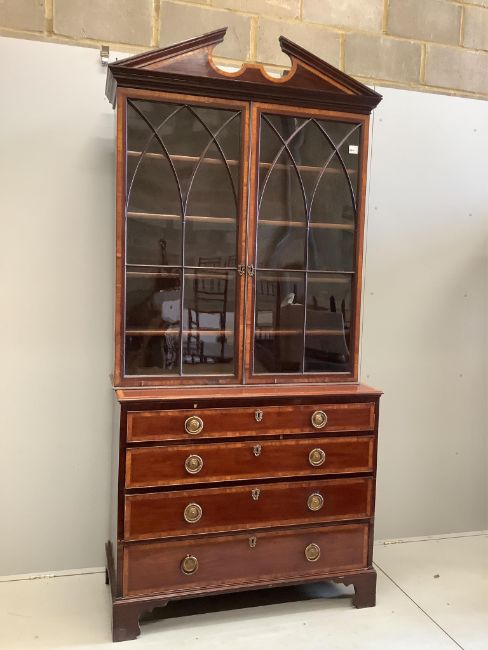 A George III and later satinwood banded mahogany secretaire chest, width 109cm, depth 51cm, height 215cm. Condition - fair