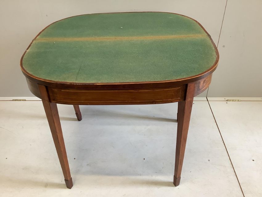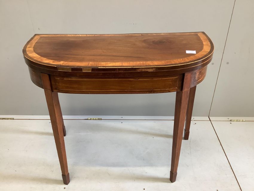 A George III banded mahogany D shape folding card table, width 91cm, depth 43cm, height 74cm. Condition - fair