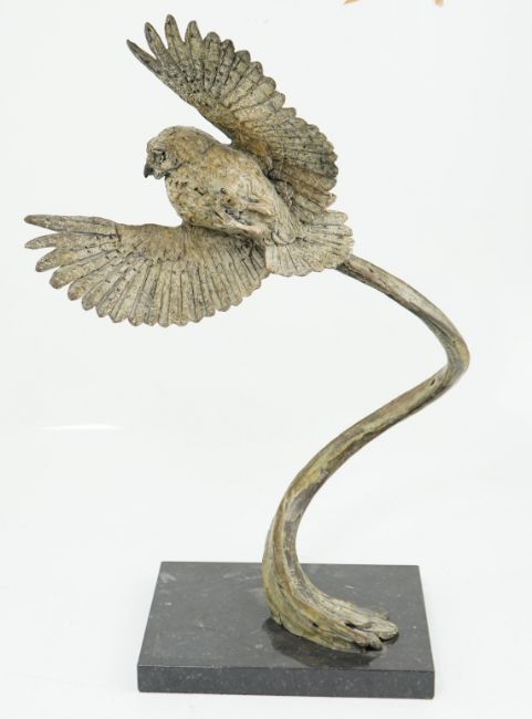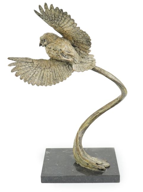 § § Hamish Mackie (b.1973), bronze, 'Little Owl', first of an edition of 22, signed in the bronze, on a fossil marble plinth, created in aid of WildEast for Co-existence, 44cm wide, 66cm high