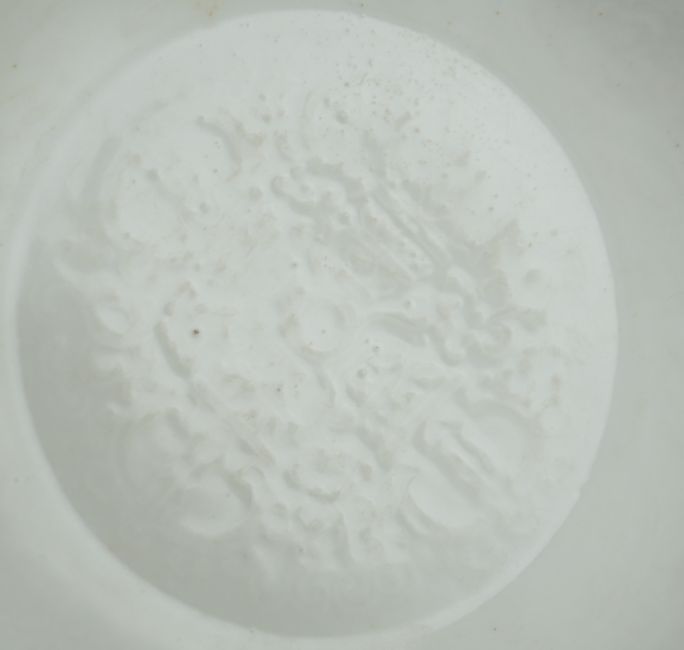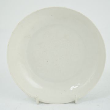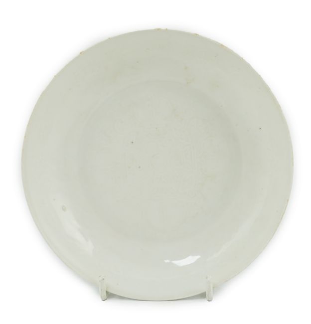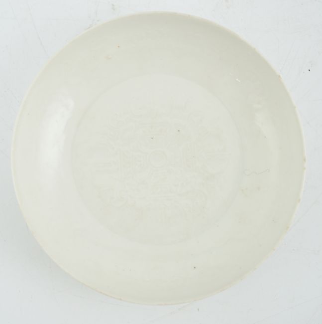 A Chinese moulded white glazed saucer dish, Yongle mark, Republic period, the centre moulded with a double vajra motif, the underside incised with anhua decoration and incised Yongle mark, 14.7cm diameter