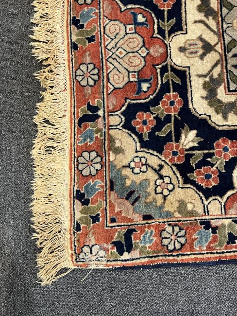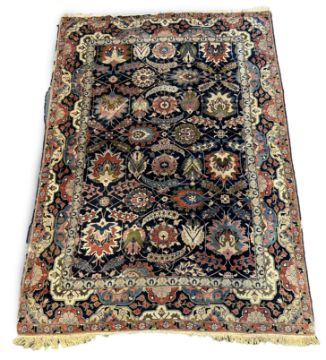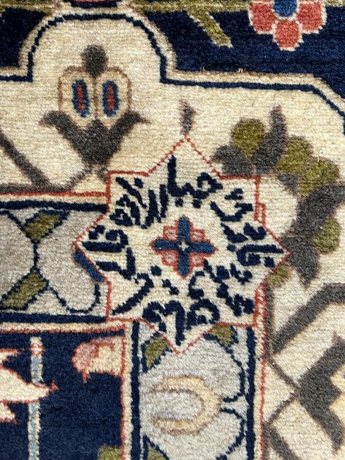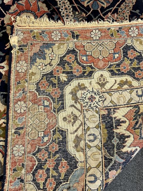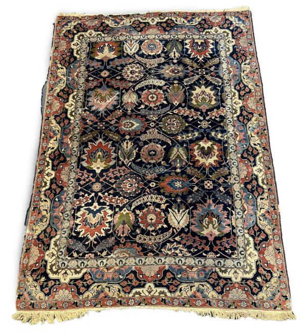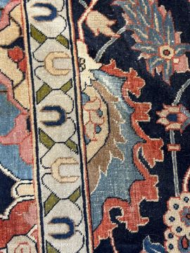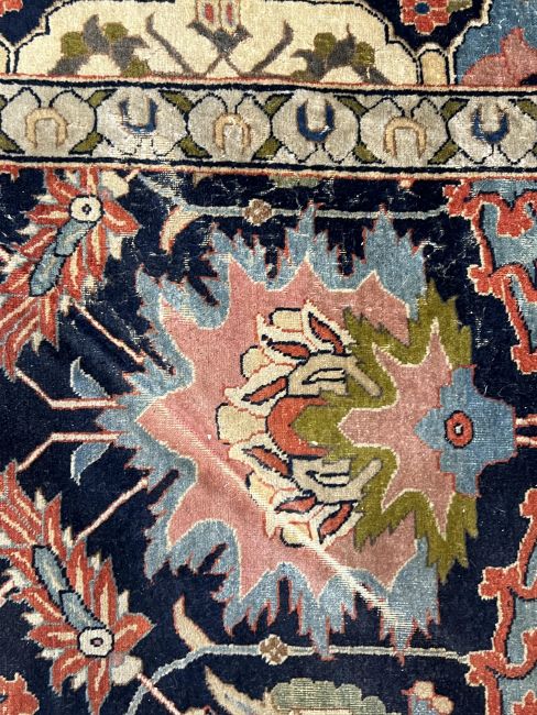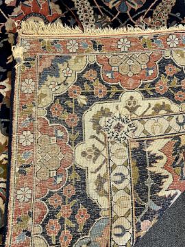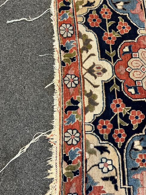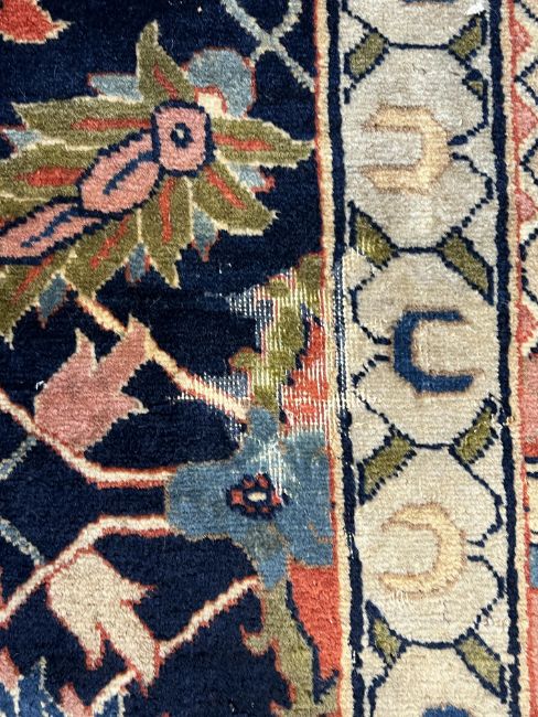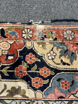 **conditionreport**Multiple areas of small moth damage, now inactive and a degree of pile wear. One fringe with around 50% losses, the other has 90% losses. The blue border to right side severely worn and becoming detached. The other worn in two areas but more stable. A 20cm worn band to one palmette where the pile has creased and then worn along this strip.