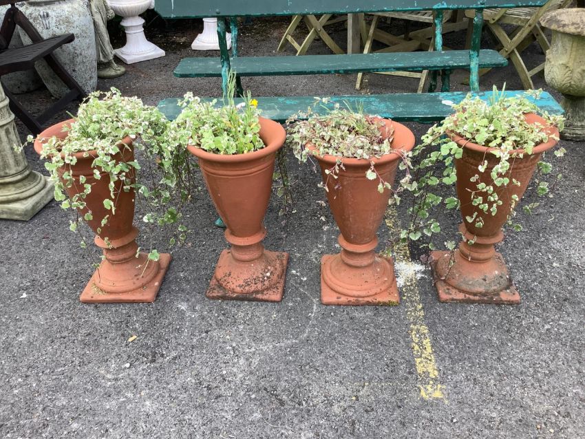 A set of four conical terracotta garden planters, diameter 31cm, height 53cm. Condition - good