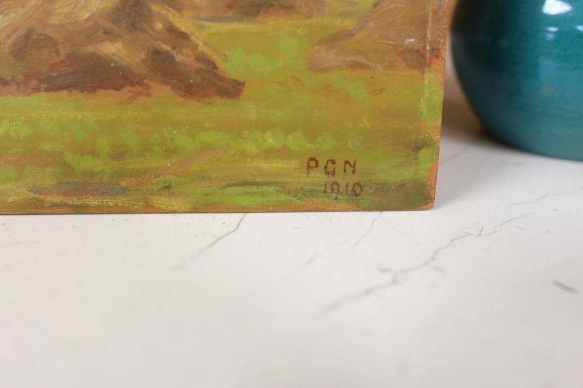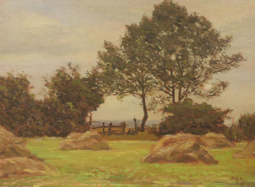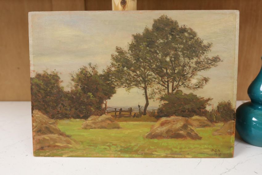 Philip Gregory Needell (1886-1974), oil on board, Hay field with landscape beyond, initialled and dated 1910, 24 x 34cm, unframed. Condition - fair, some surface dirt