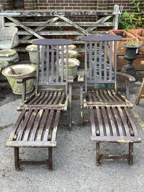 A pair of stained teak garden steamer chairs. Condition - fair