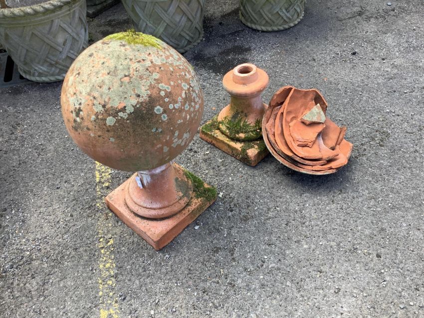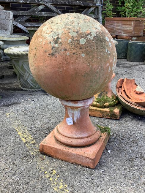 A large pair of weathered terracotta sphere garden ornaments, one in need of restoration, height 58cm. Condition - one good, one poor