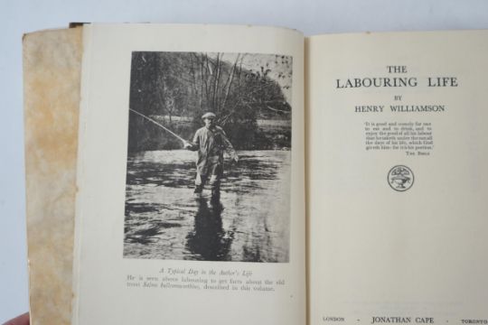 ° ° Williamson, Henry - The Labouring Life, Limited Edition (of 122 numbered copies, signed by the author). frontis., pictorial and outline coloured map on e/ps.; original vellum backed gilt cloth, gilt lettered spine and with celluloid / paper / d/wrapper, gilt top, cr.8vo. 1932
