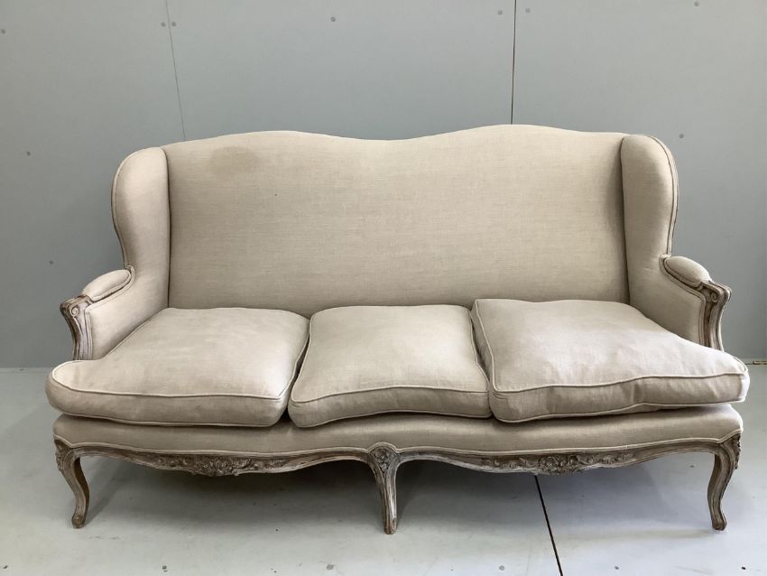 A Louis XVI style painted upholstered settee, width 180cm, depth 70cm, height 93cm. Condition - good