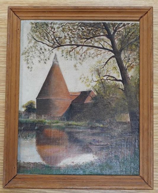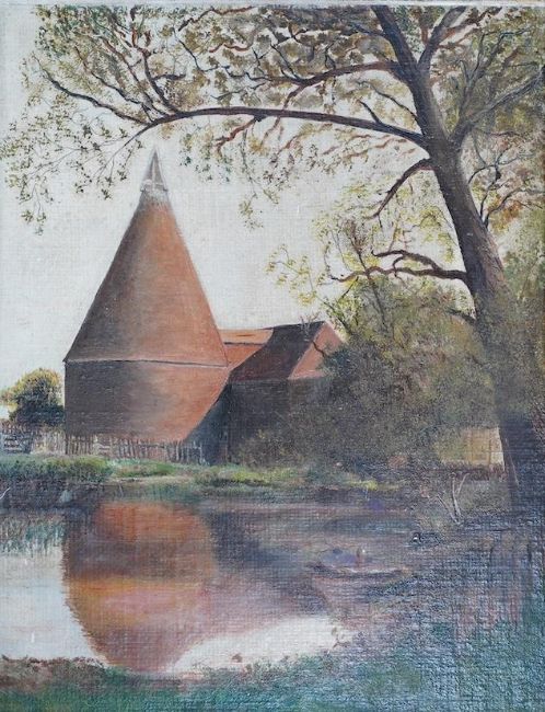 From the Studio of Fred Cuming. Late 19th / early 20th C. Primitive oil on board, Oast House, unsigned, 25 x 19cm. Condition - fair, a little dirty Note: “This is an interesting side lot of art and artistic ephemera from the extensive collection of Fred Cuming RA and his wife Audrey, who travelled and worked together around the UK and Europe. They were avid collectors of objects, anything curious or beautiful, many of these items would have caught their eye for some rare aesthetic or technical quality but quite often many items would simply have possessed a unique and naïve charm. There are several pieces that may have been the work of a student or amateur, nevertheless they found them exquisite. The majority of pieces from this small collection were displayed in their home for many years among an incredibly rich and varied array of his own work and that of his contemporaries. They would have been purchased over the course of a period spanning five decades or more, from the family’s early beginnings at Egerton House in Kent, Hythe, Wittersham and finally Iden in East Sussex where the family settled.”