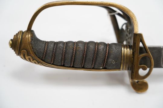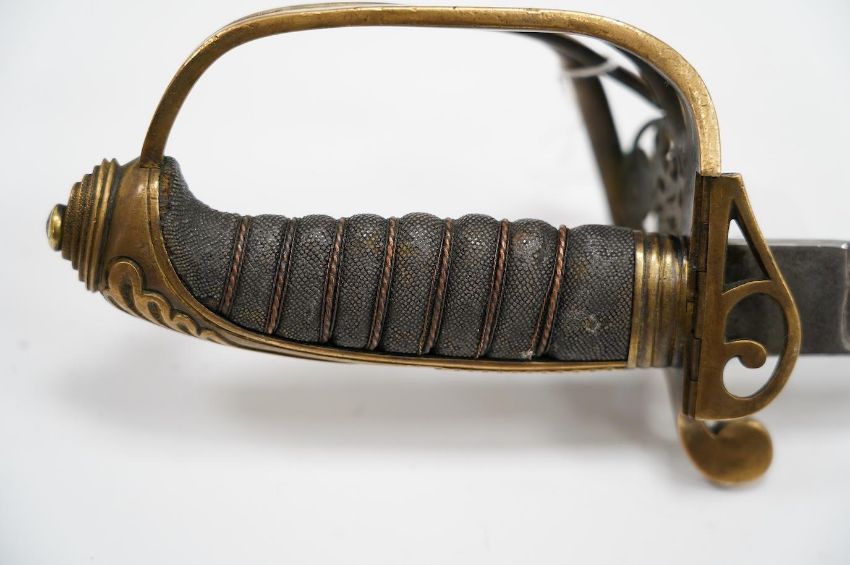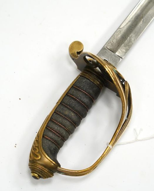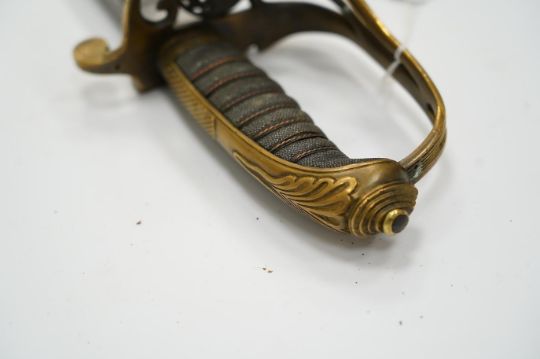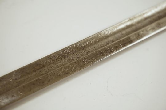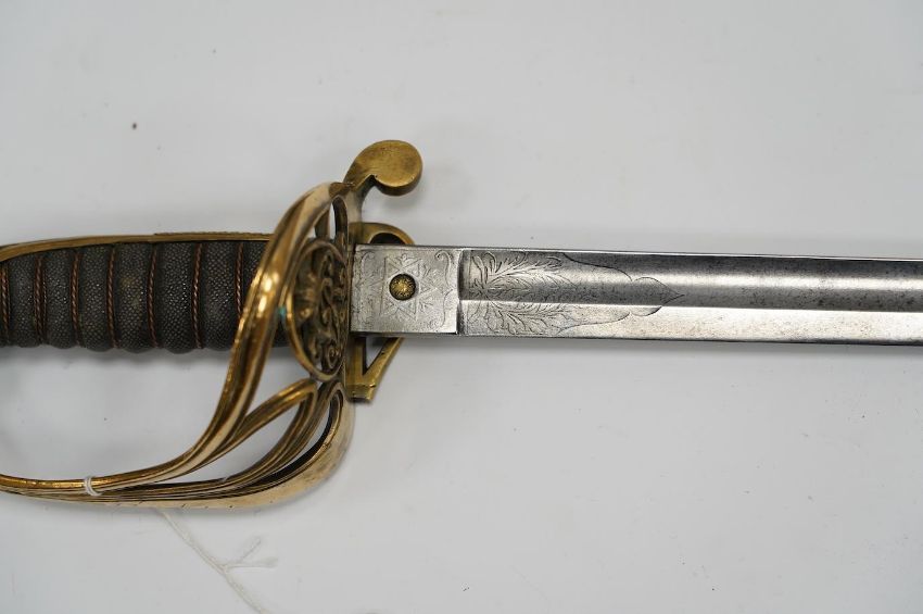 A Victorian 1845 pattern infantry officer’s sword, etched blade, regulation hilt, blade 81.5cm. Condition - good, some age wear * Due to new safety regulations and legal restrictions with ParcelForce and Royal Mail, we are unable to pack or send swords and bladed items through postal service. Collection in person or courier service is recommended *