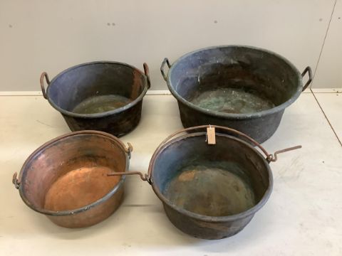 Four 19th century circular copper pans, largest diameter 66cm, height 32cm. Condition - fair
