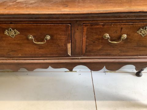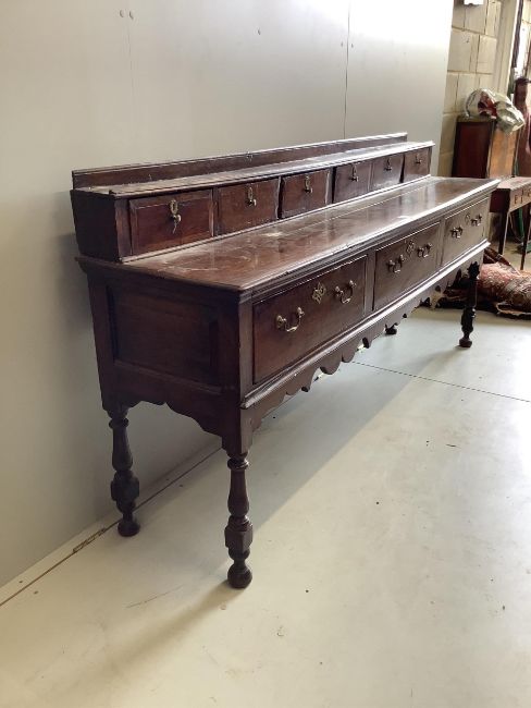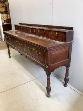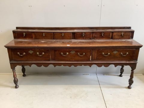 A mid 18th century oak low dresser, width 207cm, depth 46cm, height 97cm. Condition - fair
