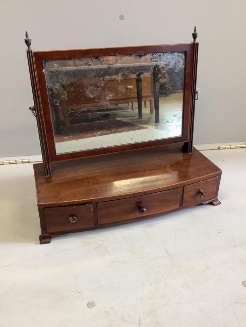 A George III mahogany box base bow front toilet mirror, width 47cm, depth 22cm, height 44cm. Condition - fair
