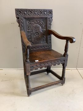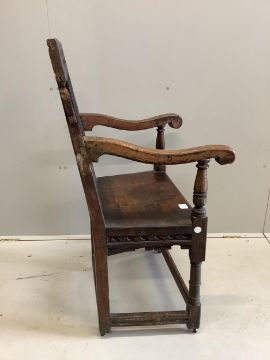 A 17th century oak wainscot type chair, width 61cm, depth 49cm, height 110cm. Condition - fair There is a split running down the back panel, splits, damage and wear to the back rail, damge to the seat.