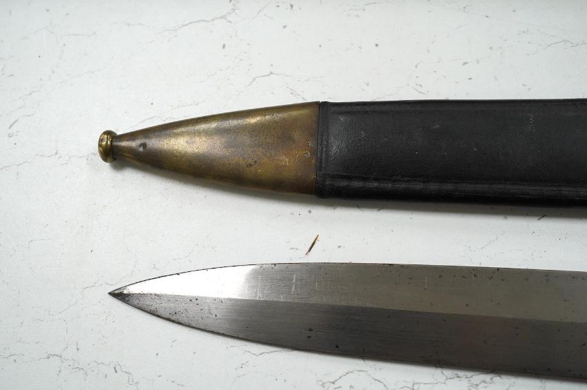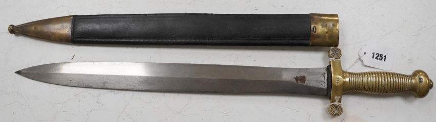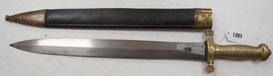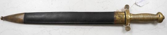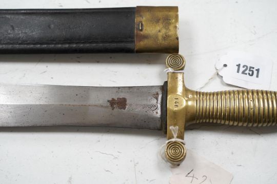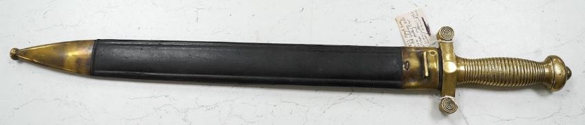 A French Gladius, regulation blade stamped ‘Chatellerault 1833’ in its scabbard, blade 48.5cm. Condition - good * Due to new safety regulations and legal restrictions with ParcelForce and Royal Mail, we are unable to pack or send swords and bladed items through postal service. Collection in person or courier service is recommended *