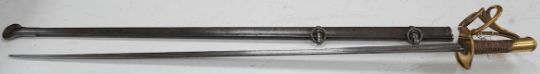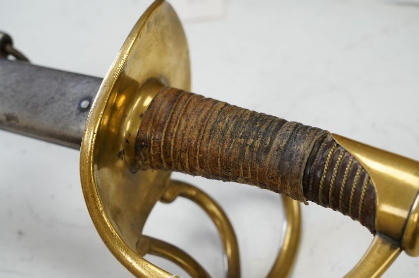 An 1854 French Curassier’s heavy cavalry trooper’s back sword with double fullered blade in its steel scabbard, blade 98cm. Condition - good * Due to new safety regulations and legal restrictions with ParcelForce and Royal Mail, we are unable to pack or send swords and bladed items through postal service. Collection in person or courier service is recommended *