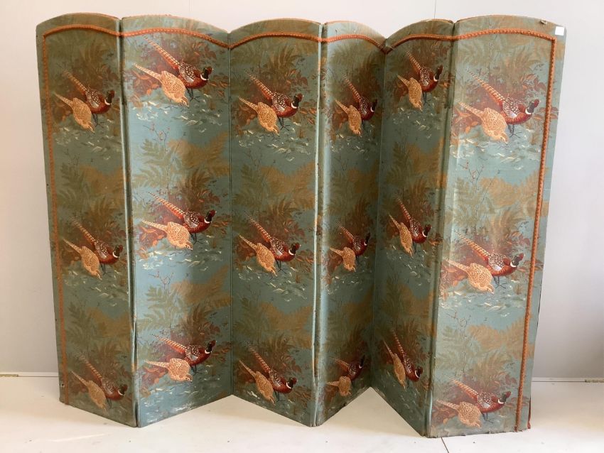 A machined tapestry six fold dressing screen decorated with pheasants, each panel width 49cm, height 183cm. Condition - good