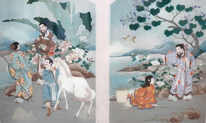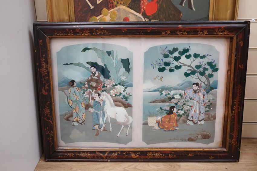 20th century Japanese School, reverse glass painted picture, Figures before landscapes, overall 39 x 59cm, housed in a painted lacquered frame. Condition - fair to good