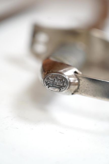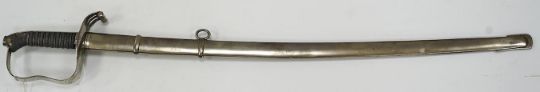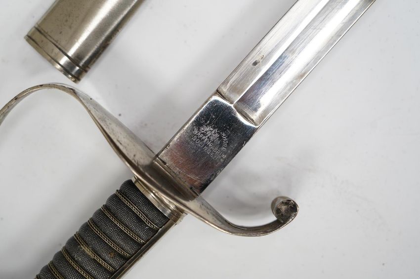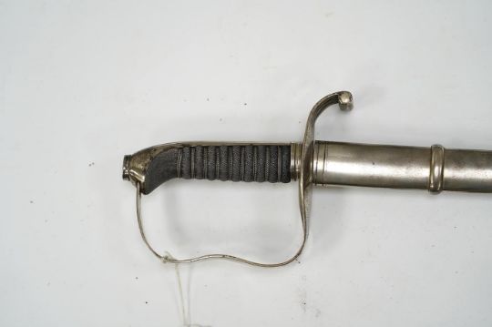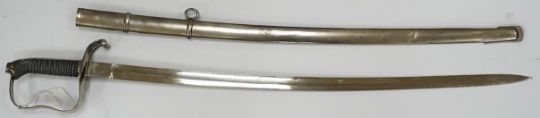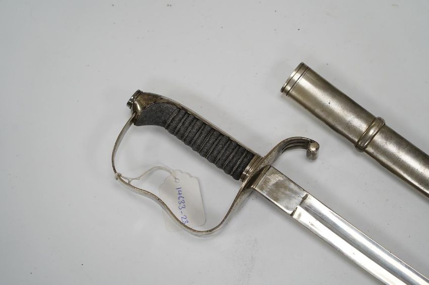 An 1861 Austrian sabre with intaglio initialled hilt and Solingen blade, in its steel scabbard, plated overall, blade 76cm. Condition - good * Due to new safety regulations and legal restrictions with ParcelForce and Royal Mail, we are unable to pack or send swords and bladed items through postal service. Collection in person or courier service is recommended * We are able to pack this item for a courier to collect. The scabbard has one significant dent and other minor nicks. The blade and scabbed are not bent. The pommel is tight and not loose. The blade is 2.5 cm in width.