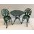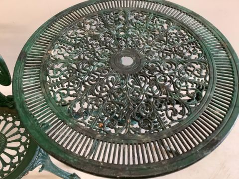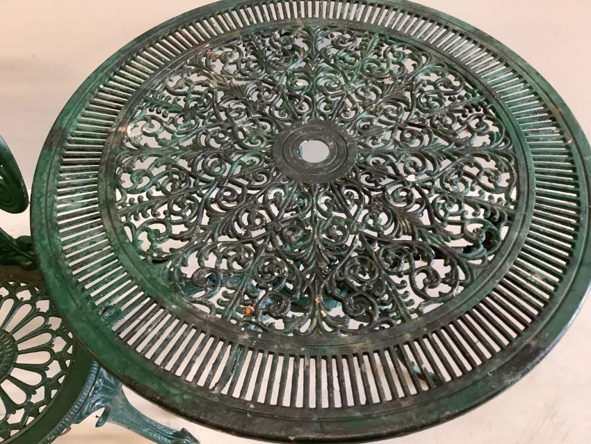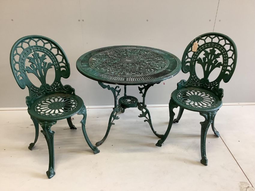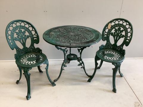 A Victorian style circular painted aluminium garden table, diameter 80cm, height 68cm, together with two chairs. Condition - fair