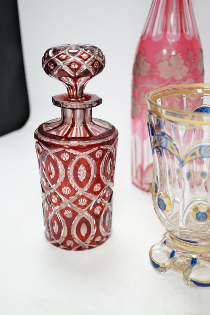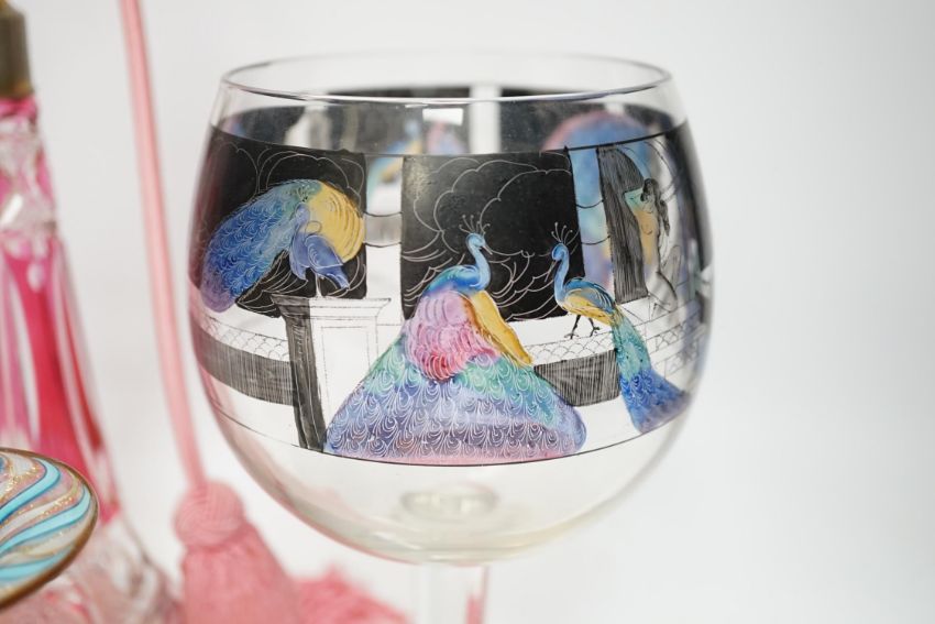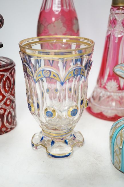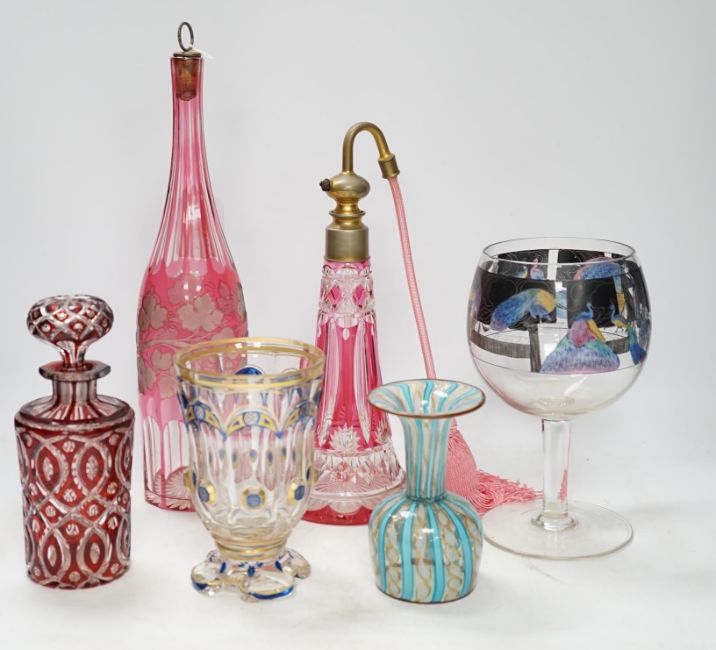 Six pieces of Victorian and later glassware including Italian Vedar cocktail goblet, Bohemian cranberry glass atomiser and art glass vase, tallest 34cm. Condition - poor, fair and good, smallest piece broken and restored, some wear to gilding