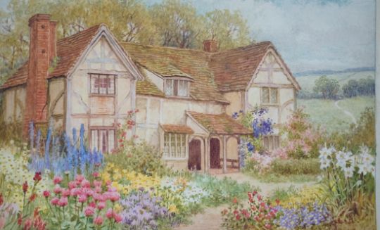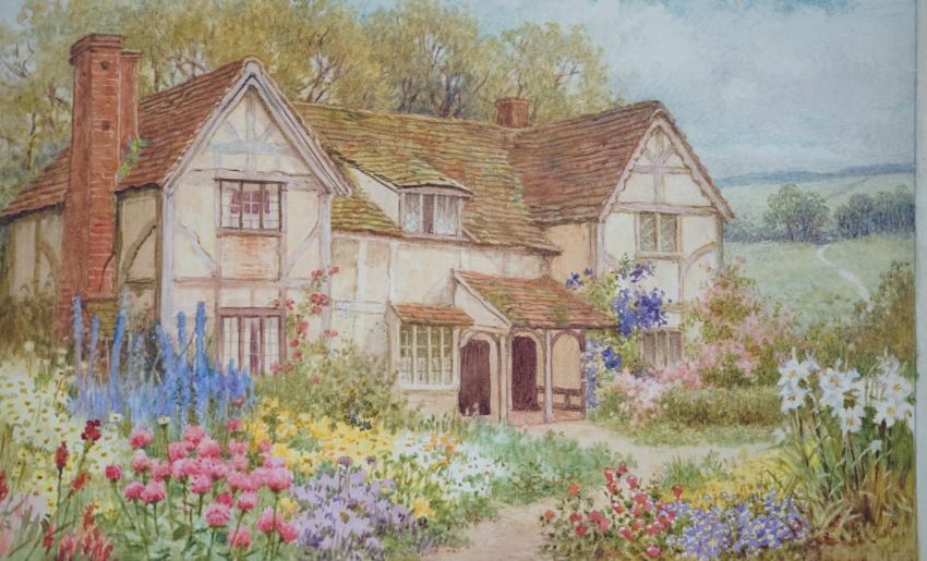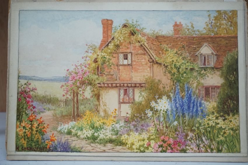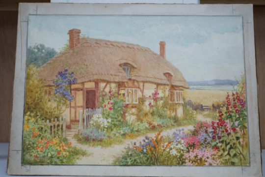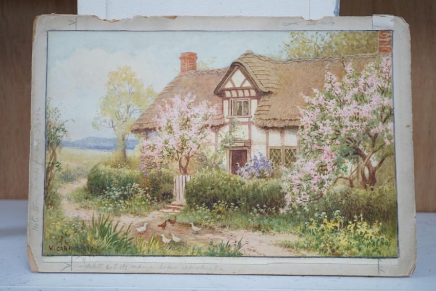 William Affleck (aka, William Carruthers, 1868-1943), four watercolours on card, ‘Springtime at Cropthorne, Worcestershire’, ‘Surrey cottage at Witley’, ‘Cottage at Welford-on-Avon, Warwickshire’ and ‘Stonewall Farm, Chalfont St Giles, Buckinghamshire’, unframed, largest 24 x 34cm. Condition - fair to good