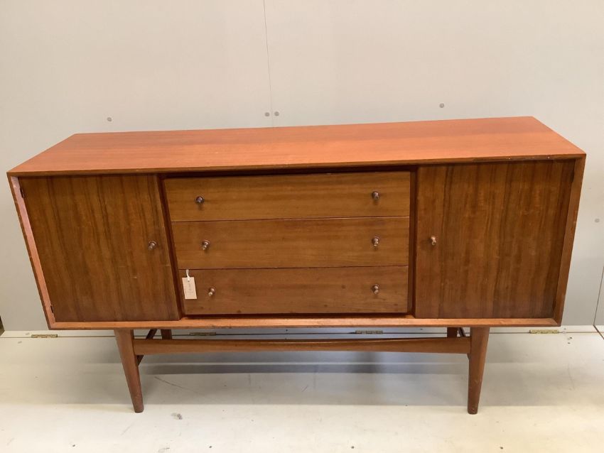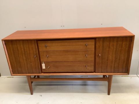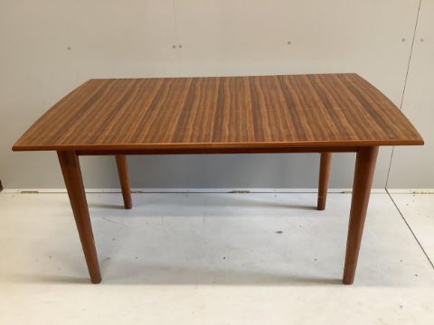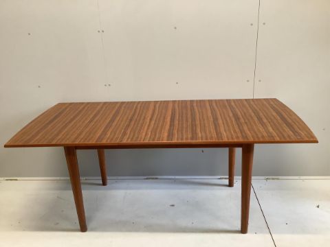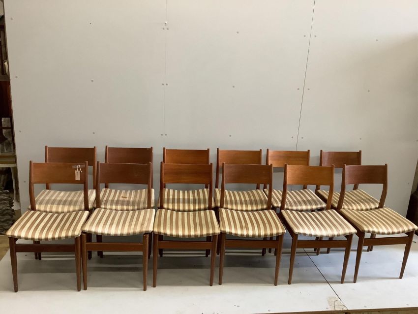 A mid century Gordon Russell teak dining suite comprising rectangular extending table, twelve chairs and a sideboard, width 140cm, depth 80cm, height 74cm. Condition - fair, with the leaf in it's an eight seater