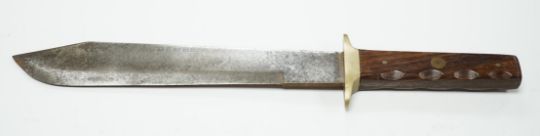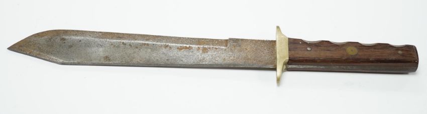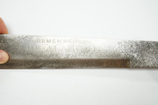 A Bowie knife with swollen blade, etched ‘Remember the Alamo 1836 the last stand of Col. Jim Bowie’, brass cross piece, riveted rosewood grips, blade length 27.5cm. Condition - fair * Due to new safety regulations and legal restrictions with ParcelForce and Royal Mail, we are unable to pack or send swords and bladed items through postal service. Collection in person or courier service is recommended *