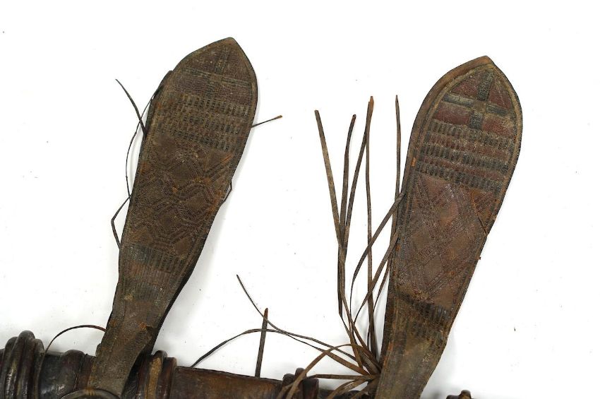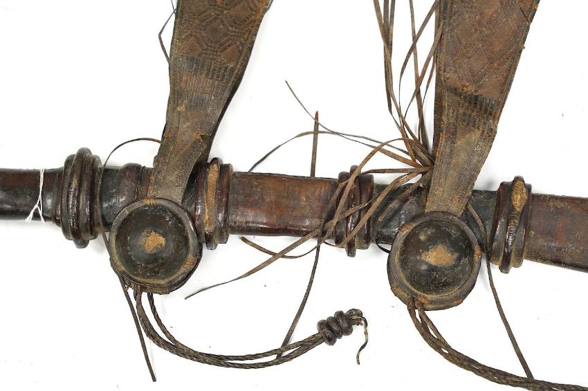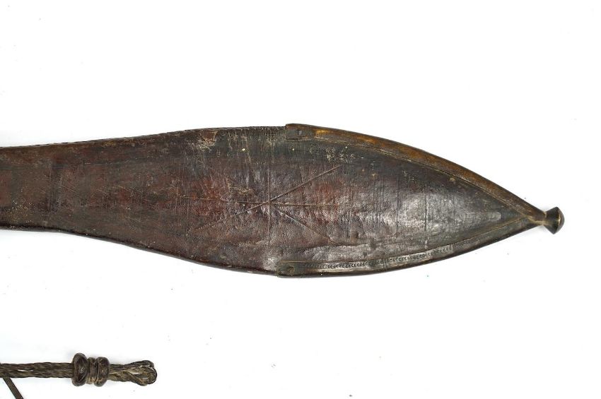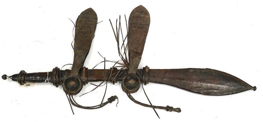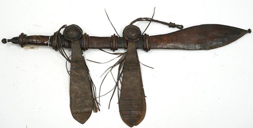 A late 19th century Nigerian Taboura from the Hausa People of Northern Nigeria, in leather scabbard, blade 55.5cm. Condition - good * Due to new safety regulations and legal restrictions with ParcelForce and Royal Mail, we are unable to pack or send swords and bladed items through postal service. Collection in person or courier service is recommended *